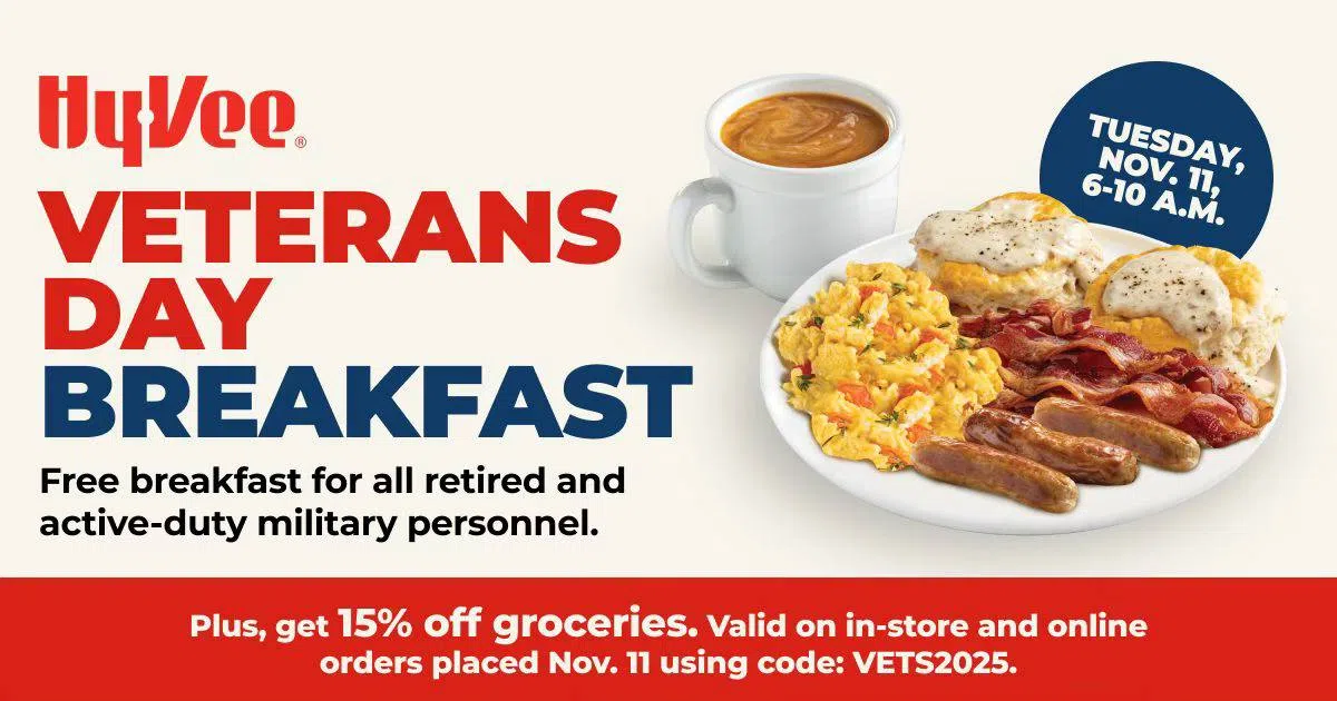 In honor of Veterans Day, Hy-Vee is proud to host a free dine-in breakfast for all retired and active-duty military personnel on Tuesday, November 11, from 6:00 a.m. to 10:00 a.m. Join us as we say thank you to those who have served and continue to serve our country.